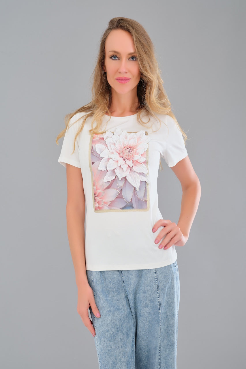 Le t-shirt 56233 de Tricotto mise sur la subtilité avec un imprimé floral blanc en relief placé à l’avant, qui apporte texture et élégance à une silhouette épurée. Le dos uni conserve une allure sobre et équilibrée, tandis que la maille extensible assure un confort optimal au quotidien. Une pièce facile à intégrer dans une garde-robe raffinée, idéale pour rehausser un look simple.