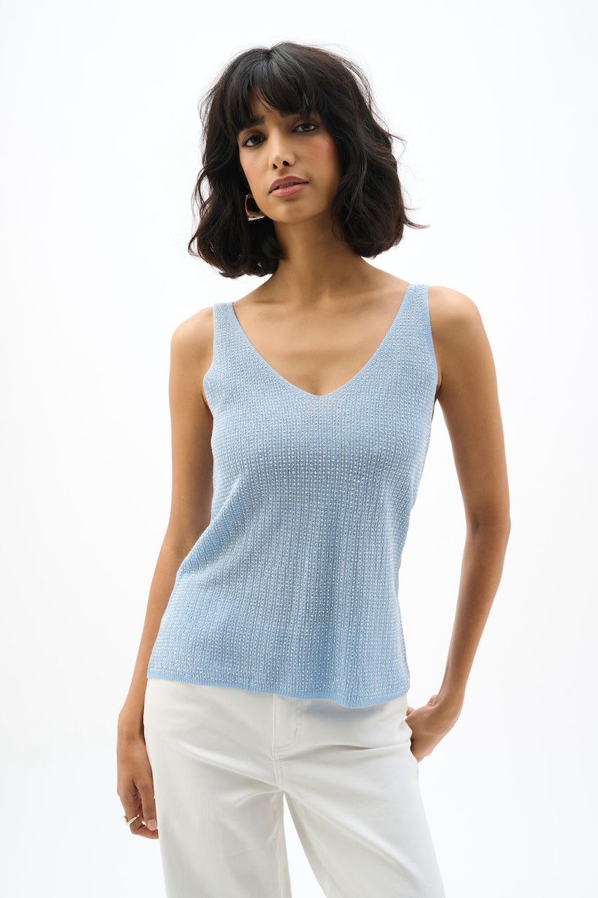 Brillez de mille feux avec cette camisole sans manches 252915 signée Joseph Ribkoff. Confectionnée dans une maille côtelée enrichie de fibres métalliques, elle capte la lumière à chaque mouvement. Son décolleté en V à l’avant comme au dos met en valeur la silhouette, tandis que ses détails thermocollés ajoutent une touche glamour irrésistible.