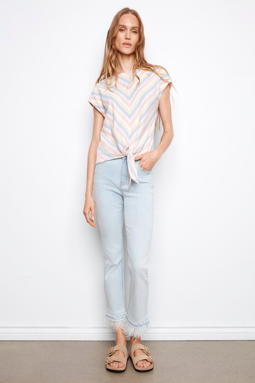 Le haut à imprimé rayé C4271R-237C de Charlie B. apporte une touche graphique et originale à vos tenues. Son encolure bateau et ses manches courtes de type cap sleeve mettent joliment la silhouette en valeur, tandis que le nœud à l’ourlet ajoute un détail tendance et féminin. Une pièce idéale pour les journées printanières et estivales.