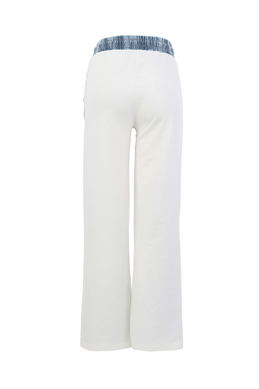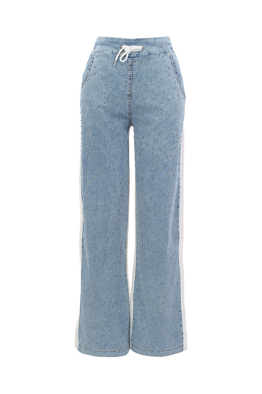 Le jean 56260 de Tricotto combine un devant en denim souple orné de pierres et un dos ivoire, pour un contraste élégant et original.