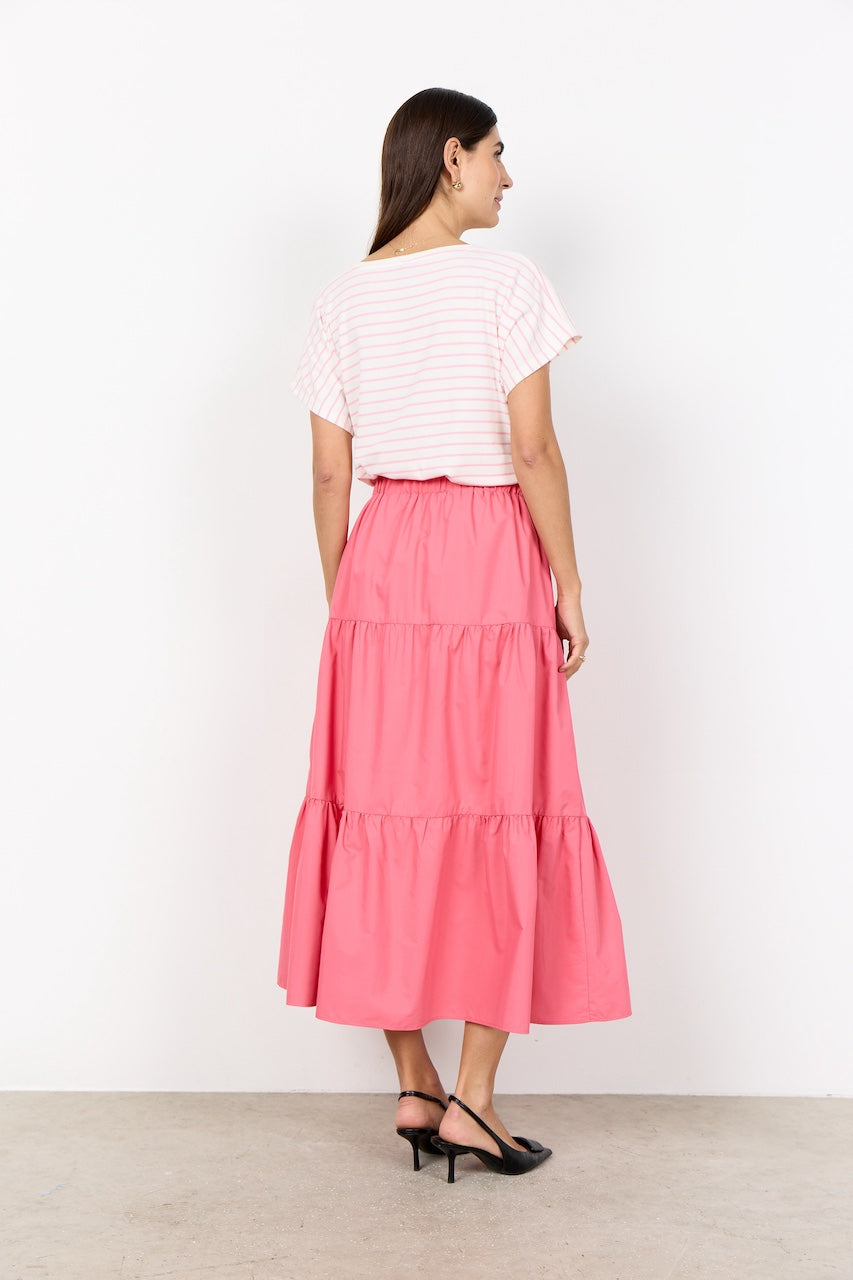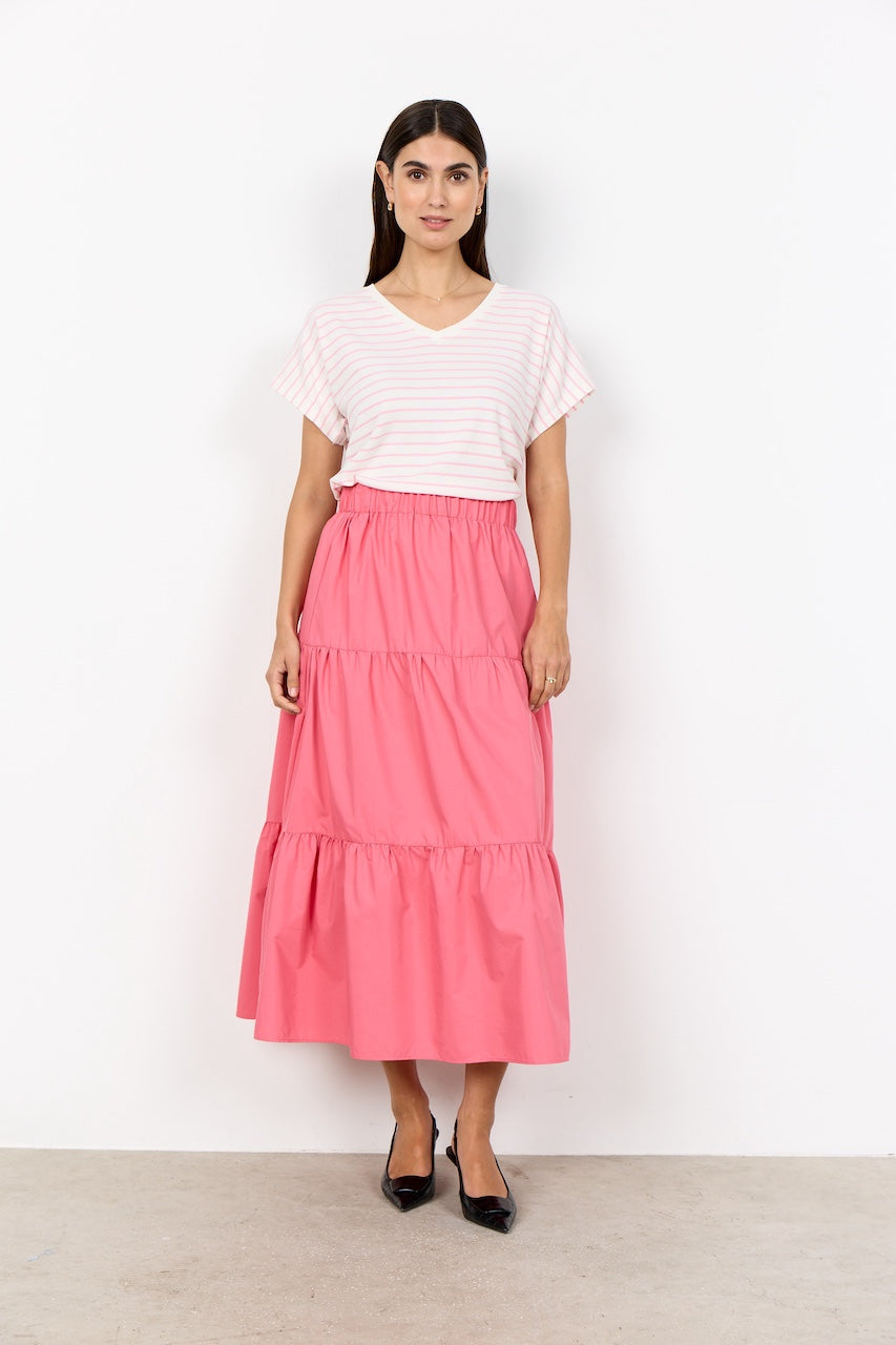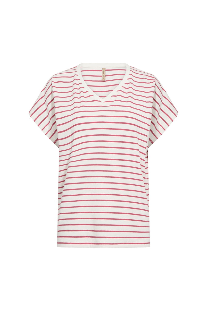 Le t-shirt 27514 de Soya Concept est conçu dans un mélange de fibres responsables, alliant coton recyclé, viscose LENZING™ ECOVERO™ et élasthanne pour une sensation douce et agréable sur la peau. Son encolure en V classique met subtilement en valeur le décolleté, tandis que son motif à rayures horizontales apporte une touche épurée et facile à agencer.