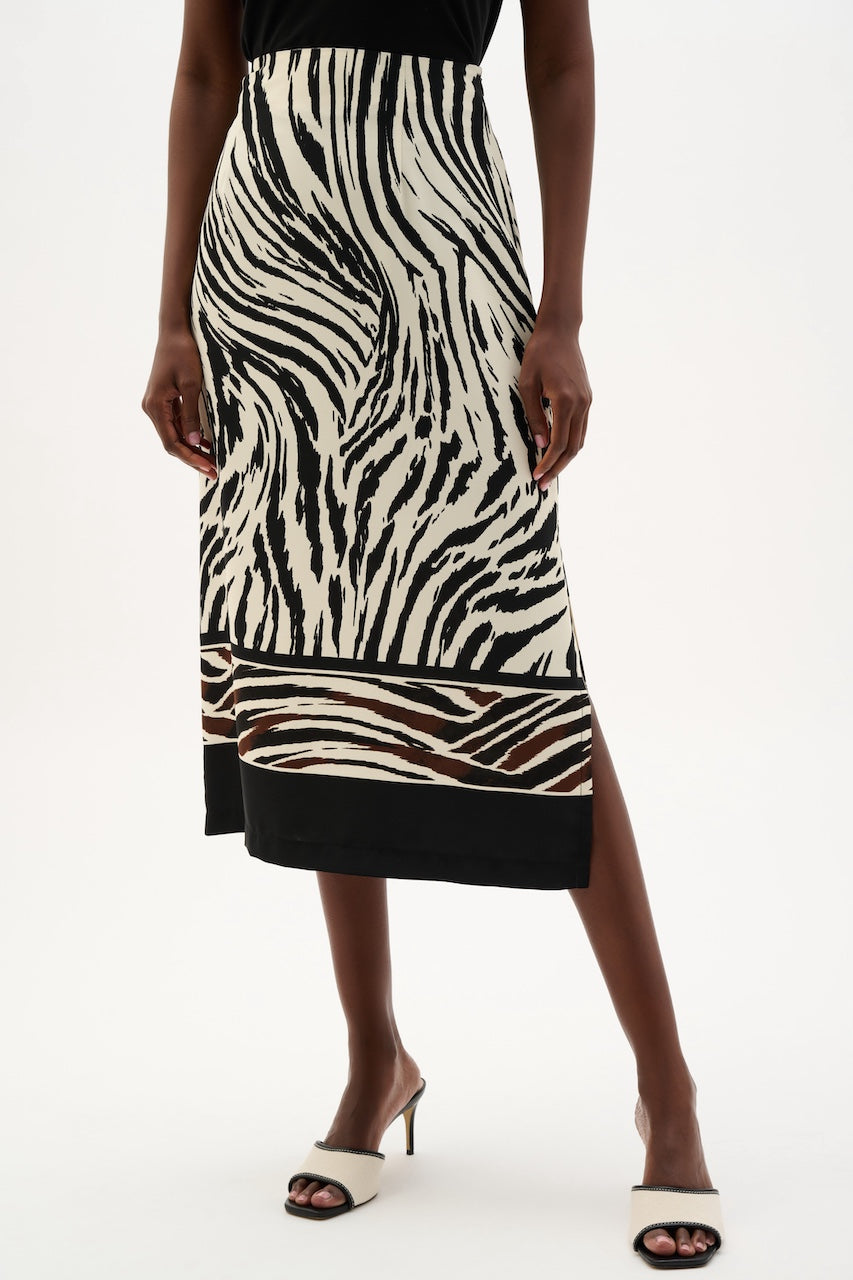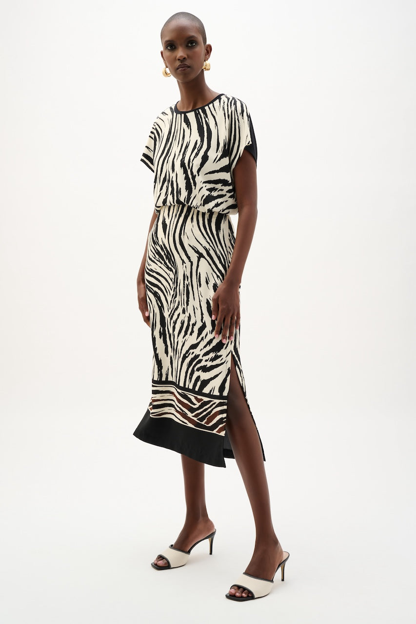 La jupe droite en tissu recyclé 262050 de Joseph Ribkoff propose un imprimé animal en bordure qui apporte du caractère à la silhouette. Les pinces à l’avant et à l’arrière assurent un ajustement précis, tandis que la fente latérale et la fermeture éclair invisible au dos complètent la finition avec élégance.