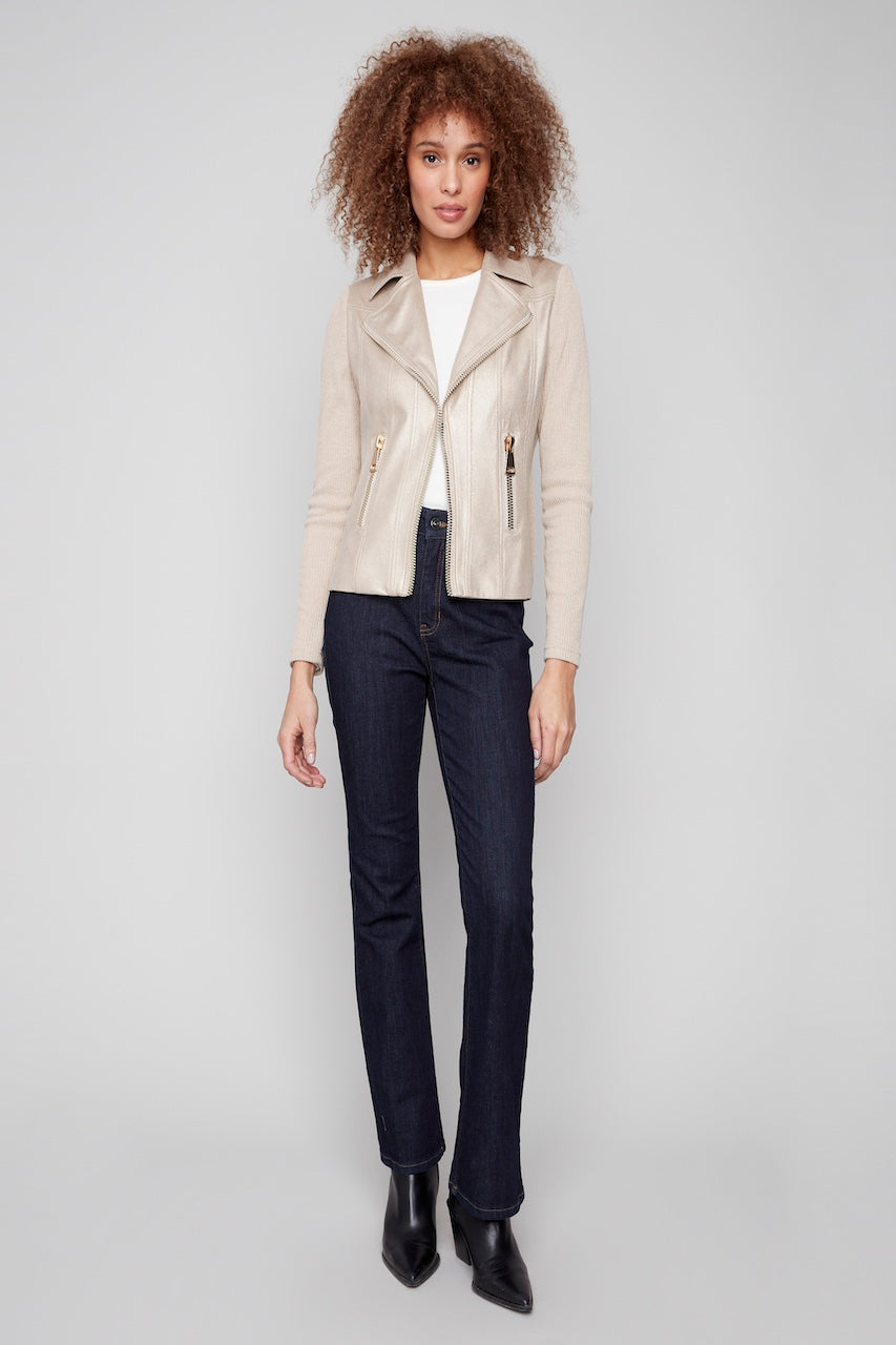Alliez élégance vintage et confort moderne avec la veste Charlie B C6273X. Sa conception ingénieuse marie une maille côtelée extensible à un tissu effet cuir vieilli, pour une silhouette à la fois ajustée et décontractée.