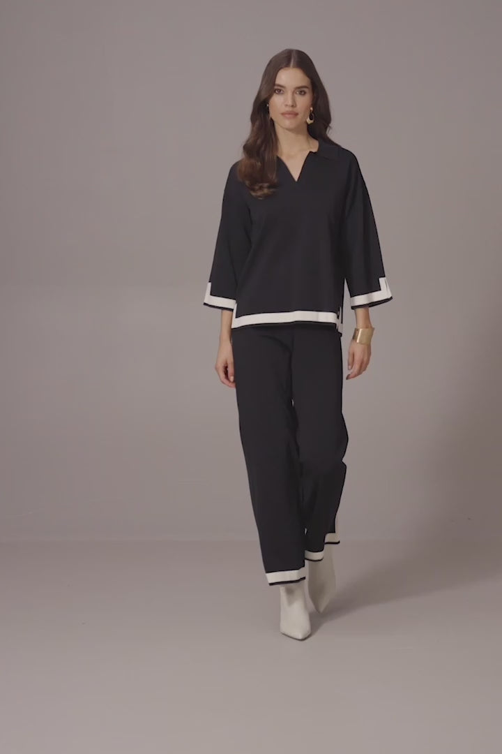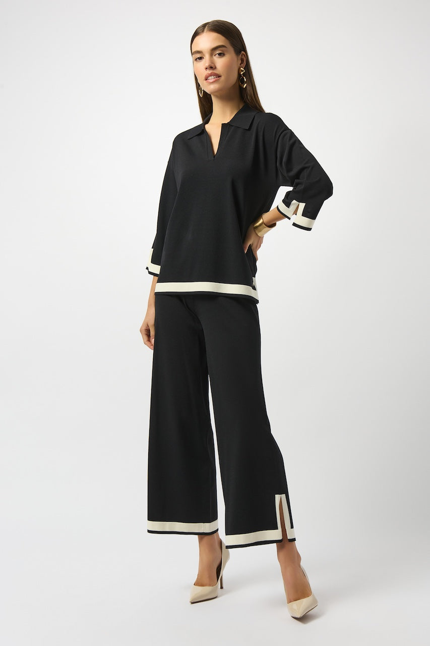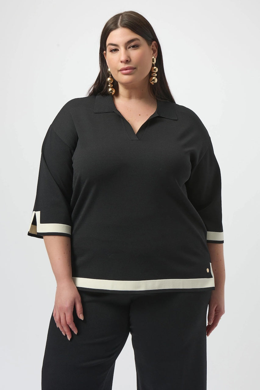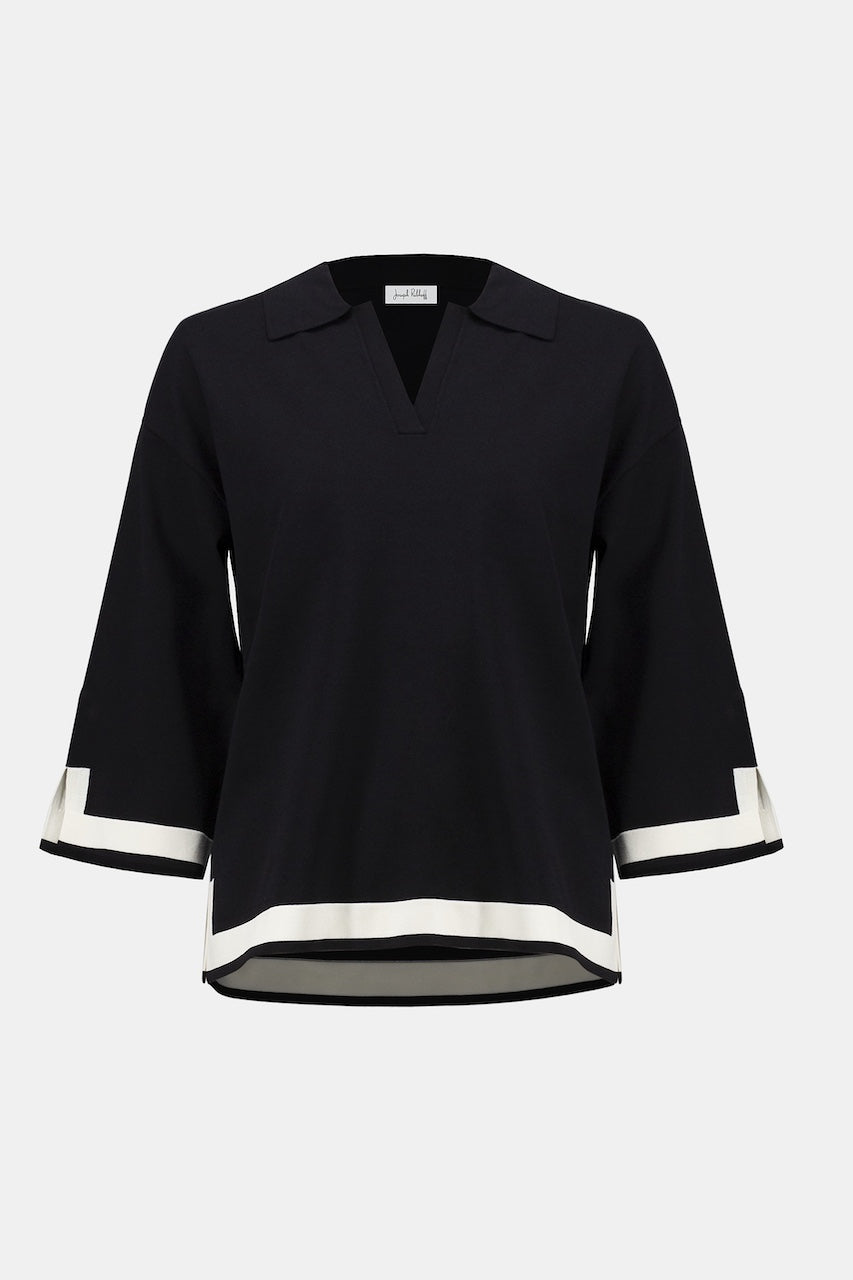 Affirmez votre style avec ce haut en tricot moderne signé Joseph Ribkoff. Conçu dans une silhouette droite flatteuse, il présente un subtil jeu de contraste au bas pour un effet bloc de couleur tout en finesse. Son col polo élégant, son encolure en V et ses manches cloche trois-quarts apportent une touche chic à cette pièce confortable. Un équilibre parfait entre décontraction et raffinement.
