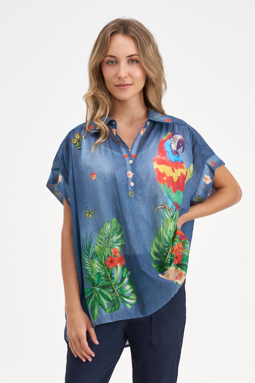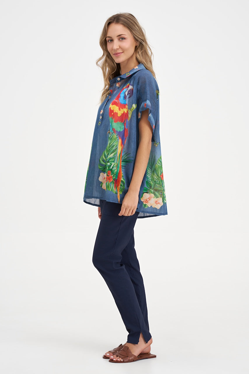 La tunique 20-3797Y de M Italy apporte une note exotique pleine de vitalité grâce à son imprimé inspiré de la faune et de la végétation tropicale. Confectionnée dans un coton léger et respirant, elle offre un confort naturel idéal pour les journées chaudes. Sa ligne décontractée et ses manches amples créent un tombé fluide, facile à porter au quotidien comme en voyage. Une pièce lumineuse qui dynamise instantanément une tenue simple.